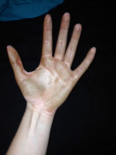 Let me start this first impression by saying I'm not a brand snob, if something works for me I don't care where it came from. Although I typically use Million Dollar Tan Cabana Tan Extreme (Ya Ya,YouTube beauty guru's made me buy it) which is a lotion and comes out white and the color develops over the next few hours. I love that shit, but you have to order it online and it's about $35 for a bottle. Haute Look does feature it quite a bit and you can score it there for about $23 and that's when I'll get it. So when I learned about this product, I was actually pretty excited. It's cheap and I can buy it in Walmart. I have never encountered any other drug store self tanner that came in mousse form before this product. I don't even like self tan that comes in mousse form but I thought for $7.99 I'll give it a try. I take a shower and exfoliate my right arm, I didn't tan my left so I could compare the color. My hopes are still extremely high at this point by the way. I pump the mousse into my hand and it's a very dark, greenish gray mousse. I pumped out quite a bit so I dot it on my upper arm and started working on my lower half. Once I start rubbing this into my skin the hopes I once held for this product are violently shot down, this was such a dry formula it made the hair on my arms brown and was so hard to rub in. I moved on to the blob I left on my upper arm (I'll admit, looking back I shouldn't have left that blob sit there for 15+ seconds) I start to rub that blob in but there is a blob stain on my arm. My skin is now incredibly dry, the hair on my arm looks brown but my skin looks gray ish, and my hand looks like this (I didn't have the glove to apply it, I thought about going to Sephora to pick up the St. Tropez one, but that won't make this product any better I guarantee it).